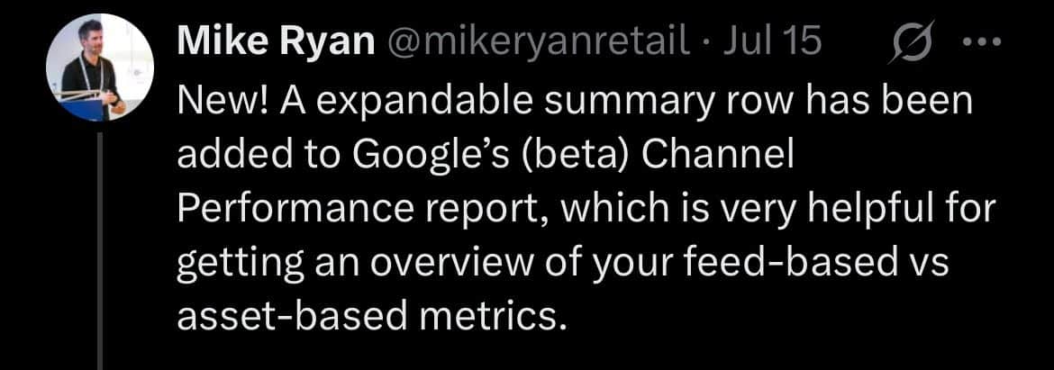 First spotted by Mike Ryan (Head of eCommerce at Smarter eCommerce) on X, this quiet beta could turn out to be a massive time-saver. Google hasn’t said a word officially, but it’s now testing a new expandable summary row in the Channel Performance report.