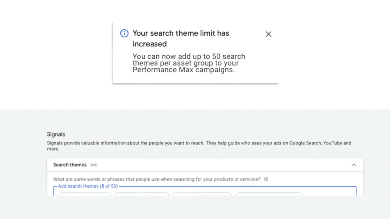 However, more isn’t always better. Adding 50 vague or overlapping themes won’t suddenly make PMax behave. If anything, it’ll dilute your signals. So approach this with strategy: group themes smartly and watch for cannibalisation with Search campaigns.