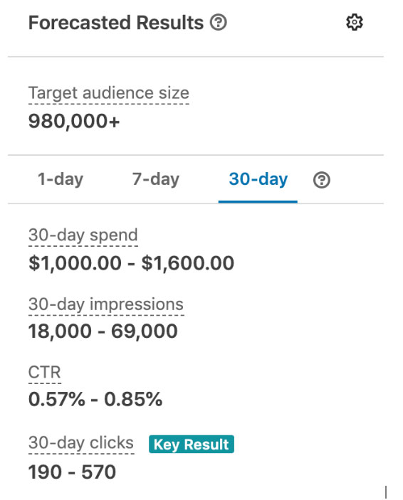 Fortunately, when you insert all the details about your targeting and your ad, you’ll see LinkedIn Ads’ calculator showing you the forecasted results based on your bid: