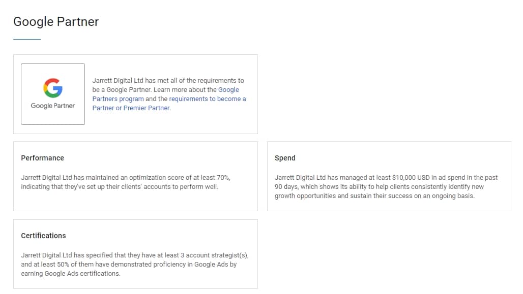 - The Google Ads manager account (you or your PPC specialist) has the Premier Partner or Partner status.