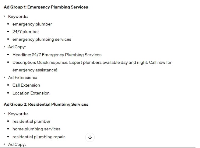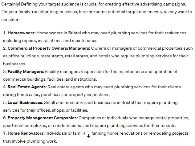 ChatGPT neatly divvied up the different types of plumbing services. This makes sense; you wouldn’t use the same ad to target prospects with an emergency and leads who need an extensive renovation project.