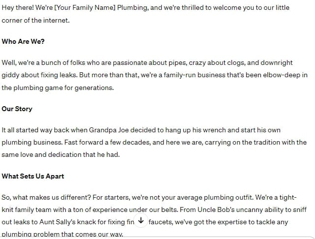 I loved the results when asking for an “About us” page for a family-run plumbing business in a casual tone of voice (with an emphasis on expertise).
