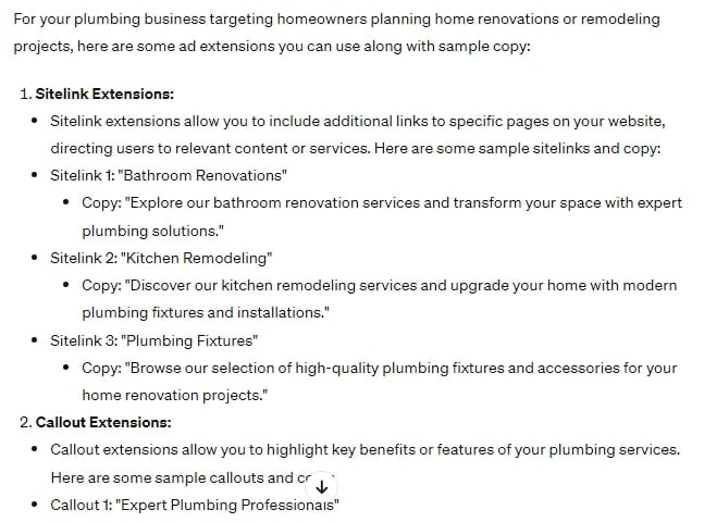 Finally, I’ve asked ChatGPT to suggest the most relevant ad extensions for our fictional plumbing campaign (bearing in mind it was last updated in 2021, so recent types will be excluded). For example, it may suggest the best description copy or approaches to Google Ads lead form extensions.