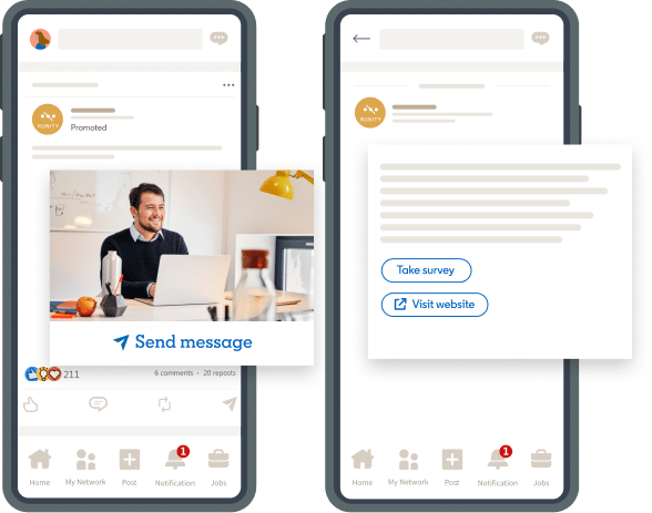 • Message Ads, which send personalised messages (“DM”s) to your prospects’ inboxes. They only include one CTA.