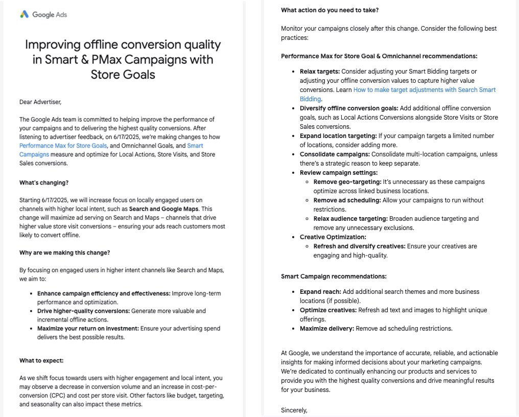 On June 17, Google tweaked how PMax, Smart Campaigns, and Omnichannel Goals handle offline conversions like shop visits or in-person sales. Instead of chasing volume, it’s shifting gears to focus on higher-intent users, especially those engaging on Search and Maps.