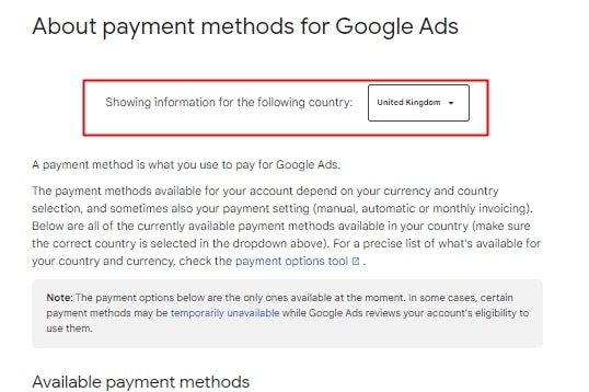 Before I dive into the specifics, make sure you check the available Google Ads payment methods for your country on this page.
